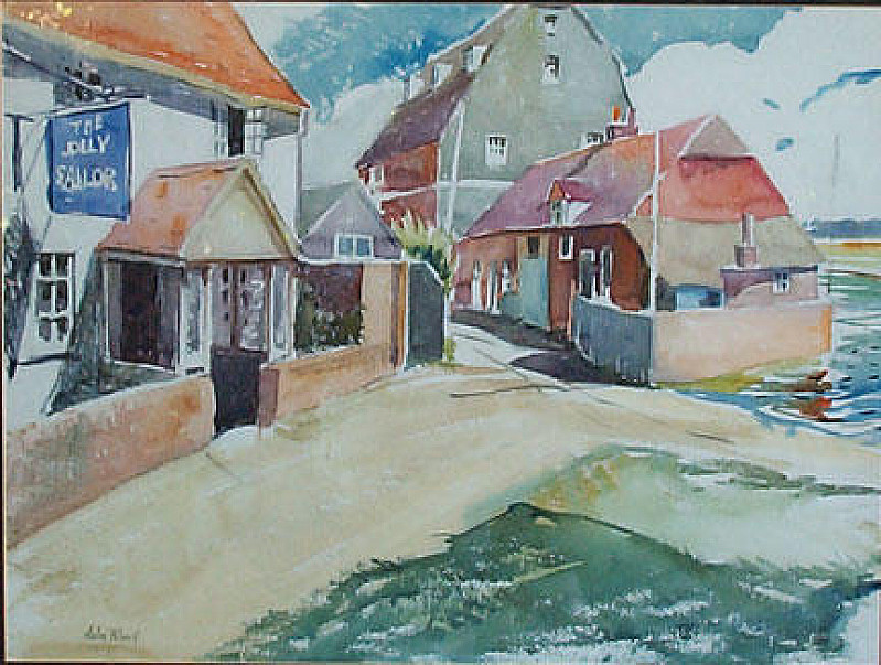 John Whorf, NA: (1903 - 1959) Studied with his father, Harry C. Whorf, and at Botolphe Studio with Sherman Kid, 1917, also BMFA with Wm. Hale and Philip Hale and in Provincetown with Charles Hawthorne, Max Bohm, Richard Miller and George Elmer Browne, Gerrit Beneker and E. Webster, plus others here and in Paris. Also studied with John Singer Sargent in Boston, 1925 (Who's Who in American Art says 1925-26, but John Singer Sargent died in 1925). Member of: ANA, NA 1947, AWCS, The Beachcombers and PAAM. Exhibits include: Grace Horn Gallery, Boston, 1924 (first solo show), WCS 1934 and 39, AIC in 1934 (prize), WMAA, BMFA, Watercolor Society, Brooklyn Museum, WCC, NOMA, and too many others to list, most with prizes or medals. Works at: MoMA, BMFA, WMAA, BMA, BM, LACMA, MIT, Fogg, MA., Addison Gallery, AIC, RISD, CAM, also in Stockholm, Sweden, Pitti Palace, Florence Italy and many others. Very well listed and accredited with an NA (highest distinction for an artist).(This painting has a very indistinct tear in the middle of the painting. It can be restored but one has to get very close to the painting to find the tear. Tear is approximately 7 inches and very clean.)FROM ASK ART: This biography was submitted by Spanierman Gallery, LLCJohn Whorf was one of the most accomplished and esteemed watercolorists of the first half of the twentieth century. Creating realist depictions of urban and rural imagery, he worked in a luminous painterly style often compared to that of John Singer Sargent and Winslow Homer.Born in Winthrop, Massachusetts, Whorf received his initial exposure to art from his father, Harry C. Whorf, a commercial artist and graphic designer. His first formal instruction began, however, at age fourteen when he enrolled simultaneously at the St. Botolph Studio in Boston, where he was taught by Sherman Kidd, and at the Boston Museum School, where his teachers were Philip L. Hale and William James. Spending the summer of 1917 or 1918 in Provincetown, Whorf attended a class with Charles W. Hawthorne, a popular teacher who rendered portraits and landscapes in a bold and painterly style. The Cape Cod landscape had a deep effect on Whorf and he would return to render it continuously throughout his life. He was also attracted to Provincetown's growing art colony, and during his first stay he met such leading contemporary painters as Max Bohn and E. Ambrose Webster. About 1919, Whorf visited France, Spain, Portugal and Morocco. In Paris, he enrolled briefly at the Ecole des Beaux-Arts, the Grande Chaumière, and the Académie Colarossi. During his time abroad, Whorf turned increasingly away from oil painting and began to focus on watercolor, which he found suited his transient lifestyle and his expressive and aesthetic interests. Whorf returned to Boston during the early 1920s. In 1924, his first solo exhibition was held at the Grace Horne Gallery. The show was extremely well received; fifty works were sold, and Whorf was commended as Boston's leading watercolorist by the press. His paintings also captured the attention of John Singer Sargent, who purchased a watercolor from the artist. Whorf claimed that following his successful debut, he received informal instruction from Sargent. Throughout the rest of his career, Whorf remained a popular and prolific artist. He exhibited his work annually at Grace Horne in Boston and at the Milch Gallery in New York; during the summers, he showed at the Shore Galleries in Provincetown. He depicted landscapes and figural works, however, he is best known for his city views which have been compared to those of Edward Hopper and Reginald Marsh for their realistic approach. Yet Whorf's fluid technique reflects the more painterly styles of Sargent and American Impressionist Frank Benson. He developed a confident and spontaneous method of applying his paint, creating works in which he interspersed sparkling transparent washes with areas of deep opaque color.Although he often traveled in America and abroad in search of painting subjects, Whorf and his wife Vivienne settled in Provincetown in 1937. There the artist painted landscapes and figural subjects, and continued to enjoy a successful career. He was one of two contemporary Massachusetts artists represented in the Museum of Modern Art's 1938 exhibition of American art created in Paris. In 1947, he was elected a member of the National Academy of Design. This biography was submitted by Pierce Galleries IncWhorf, JOHN National Academician (American, 1903-1959):John Whorf is considered one of the finest American watercolorists from the early 20th century and his style was most influenced by John Singer Sargent. Whorf was born in Winthrop, MA in 1903 and died in Provincetown in 1959. He studied with his father Harry C. Whorf; at the St. Botolph Studio in Boston with Sherman Kidd at the age of 14; at Boston's Museum School with William James and Philip Leslie Hale in 1917; and in Provincetown after 1917-1918 with Charles W. Hawthorne; with Max Bohm, Richard Miller, Garrett Beneker, George Elmer Browne and E.A. Webster in Provincetown; and in Paris after 1919 at the Academy de la Grande Chaumiere, the Ecole des Beaux Arts and the Academie Colarossi and with John Singer Sargent in Boston as late as 1924-1925.Whorf was an Associate and a full Academician of the National Academy of Design (1947) and a member of the American Water Color Society; the Florida Water Color Society; The Beachcombers; and the Provincetown Art Association. He was given his first solo exhibition in 1924 at the Grace Horne Gallery in Boston and the Milch Galleries in New York gave him 32 solo exhibitions. Awards include medals the California Water Color Society; Art Institute of Chicago (1939, 1943) and an honorary M.A. from Harvard University in 1939. The artist's work is represented at Museum of Fine Arts (Boston); Metropolitan Museum of Art; M.I.T.; Fogg Art Museum; Addison Gallery of American Art; Amherst College Art Museum; John Herron Art 