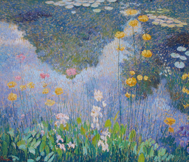 Open, light, and airy, Barber's paintings are typified by intensely saturated "broken color" brushwork of great chromatic complexity. His subject matter is primarily drawn from the area near his Cape Cod home, but is frequently supplemented by materials from his travels in France and Italy and from urban settings, the latter generally public parks and gardens.