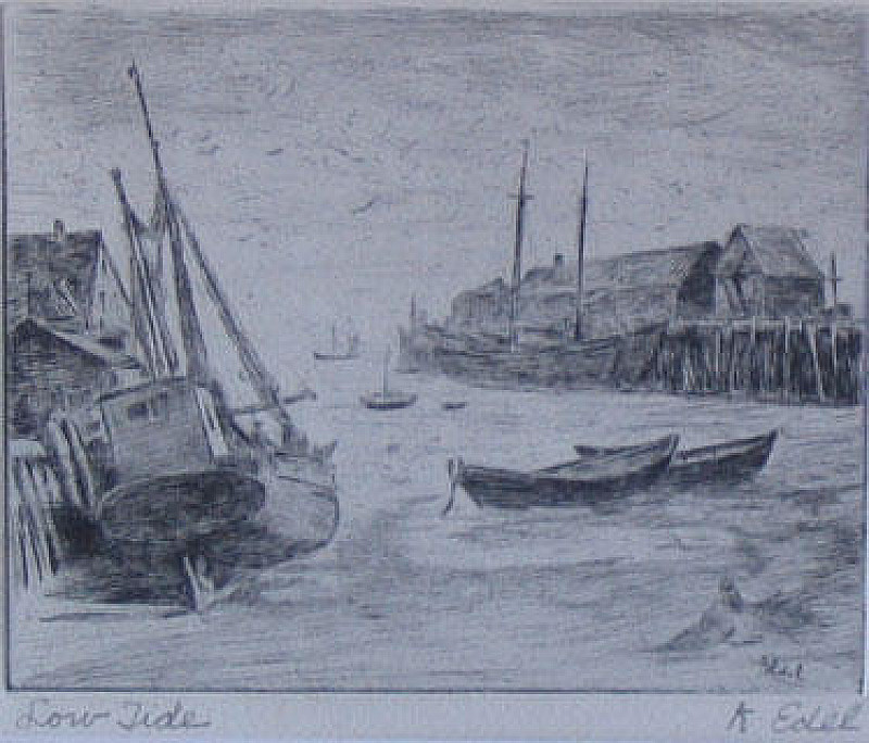Albert Edel: (1890 - 1969) Strong affiliation with Provincetown and Massachusetts. Often known for his marine renderings.He had a shop in Provincetown in the 1960's. Was a predominant etcher.FROM ASKART: Albert Edel was born in France in 1890. He showed in the Provincetown area from c.1920 to c.1940. His work was also displayed in the Edel Gallery in Provincetown. He worked in oils, watercolors, drawings, and etchings. His style is "representational." He may have been married to Stella Edel, a famous Provincetown block printer. He died in 1961.