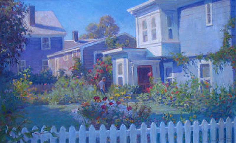 _x001a_Provincetown Garden (on Pearl Street)_x001a_, oil on panel, 20 x 32, Signed Lower Right, gold gilt frame. Artist_x001a_s label verso.