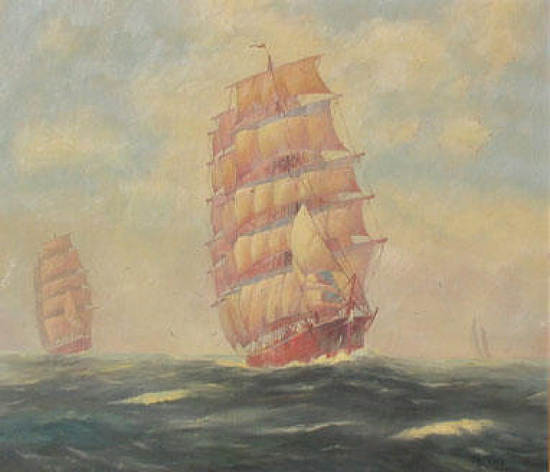 J. A. Chase (John Allen): (1882-1965) New Bedford Marine painter. This painting exhibited in New Bedford Art Club, 1907-14, 1917, New Bedford Five Cents Savings Bank, c.1950. Listed in Artists of New Bedford, Massachusetts.